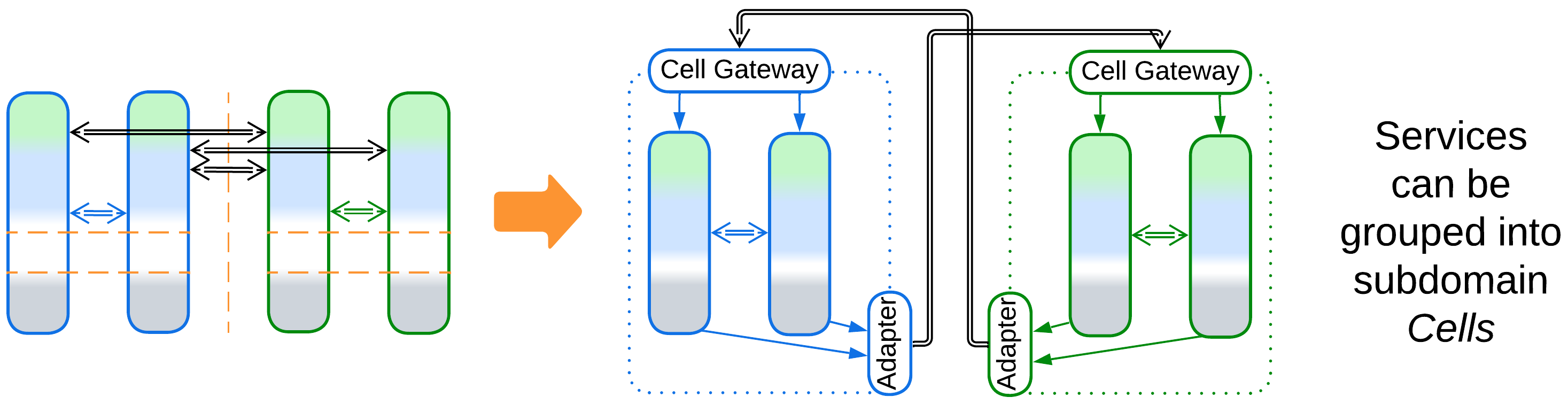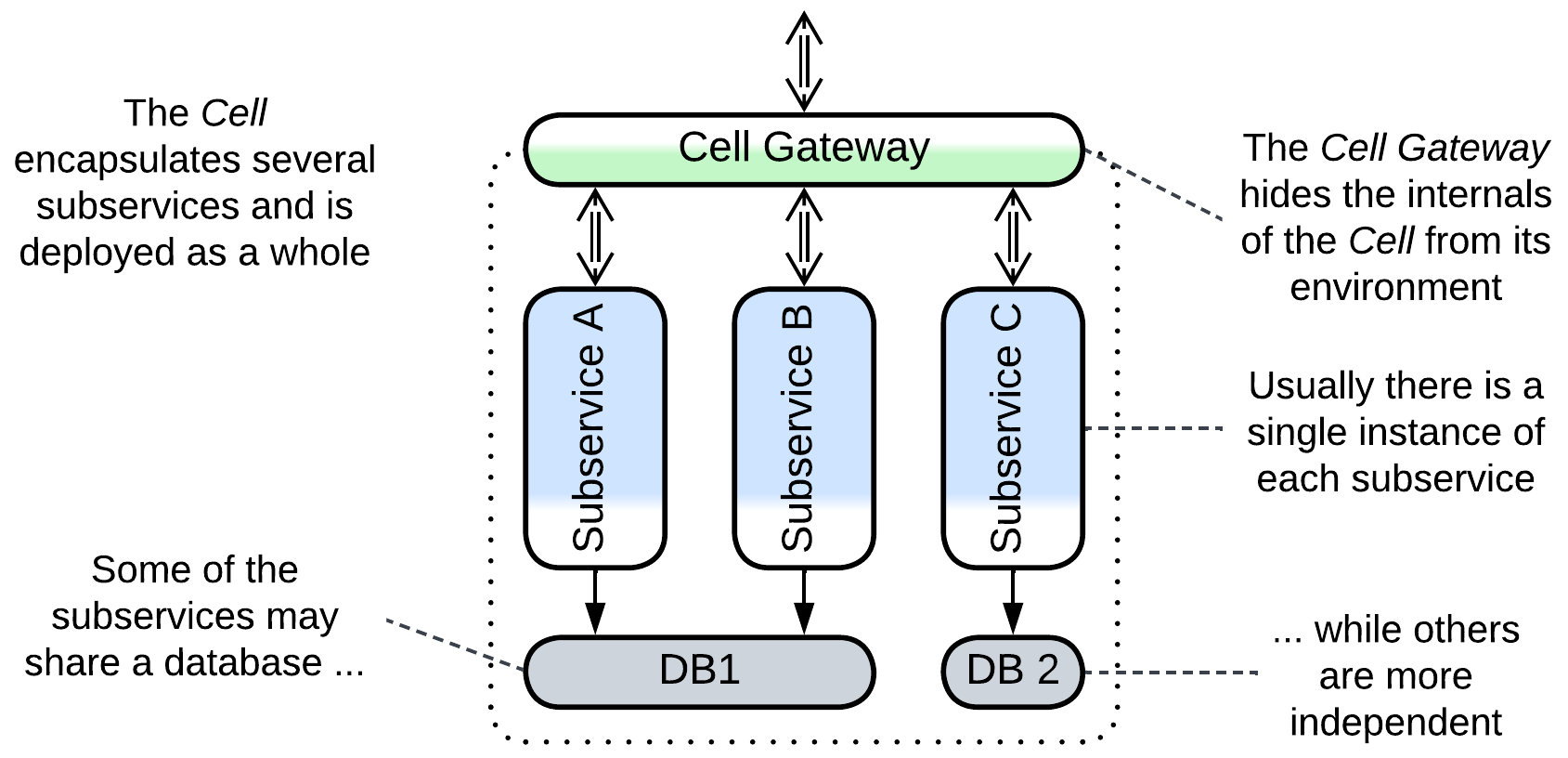 - Alternatively, coupled services may be clustered into co-deployed Cells to reduce operational complexity.