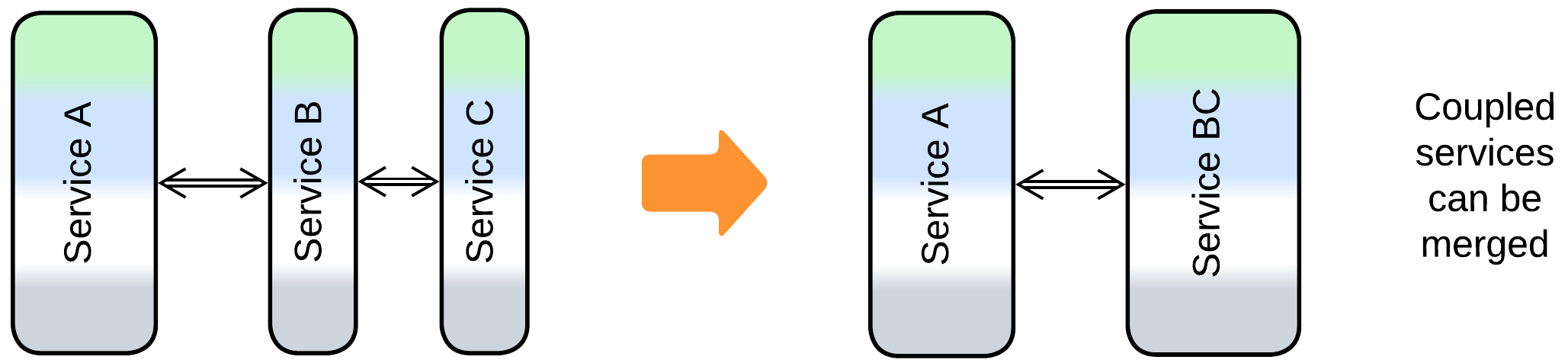 - Two services may become so strongly coupled that they fare better if merged together, or the entire system may need to be glued back into a Monolith if the domain knowledge changes or if interservice communication strongly degrades performance.