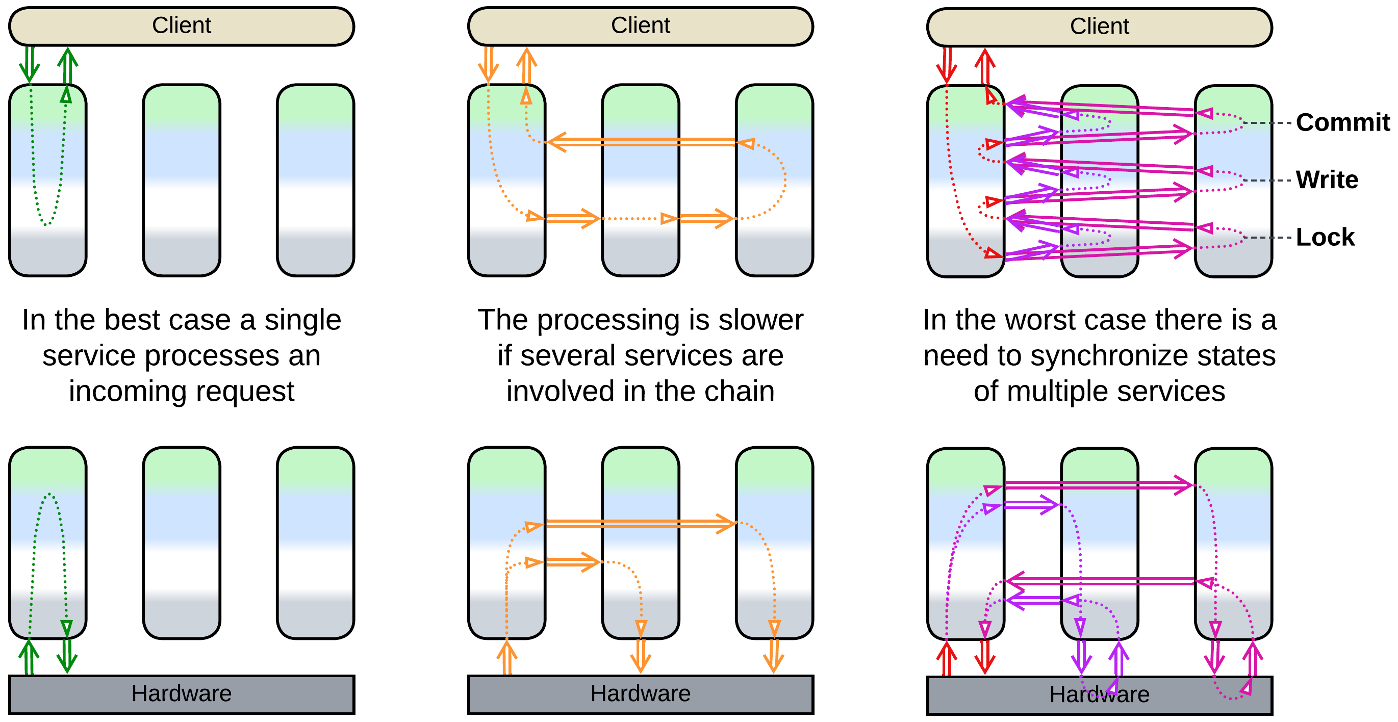 The most common modifications of a system of Services involve supplementary system-wide layers which compensate for the inability of the services to share anything among themselves: