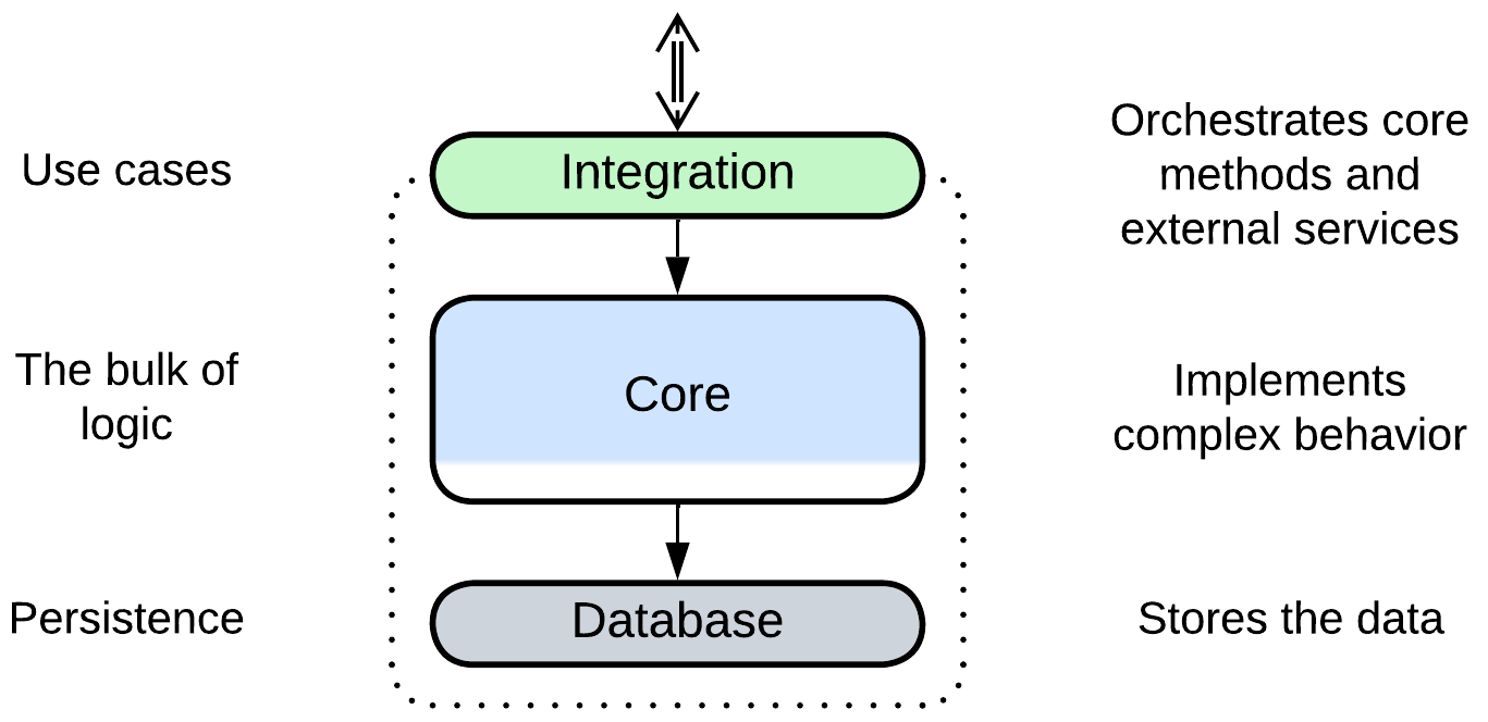 Another benefit comes from the existence of the upper integration layer which may orchestrate interactions with other services, isolating the lower layers from external dependencies.