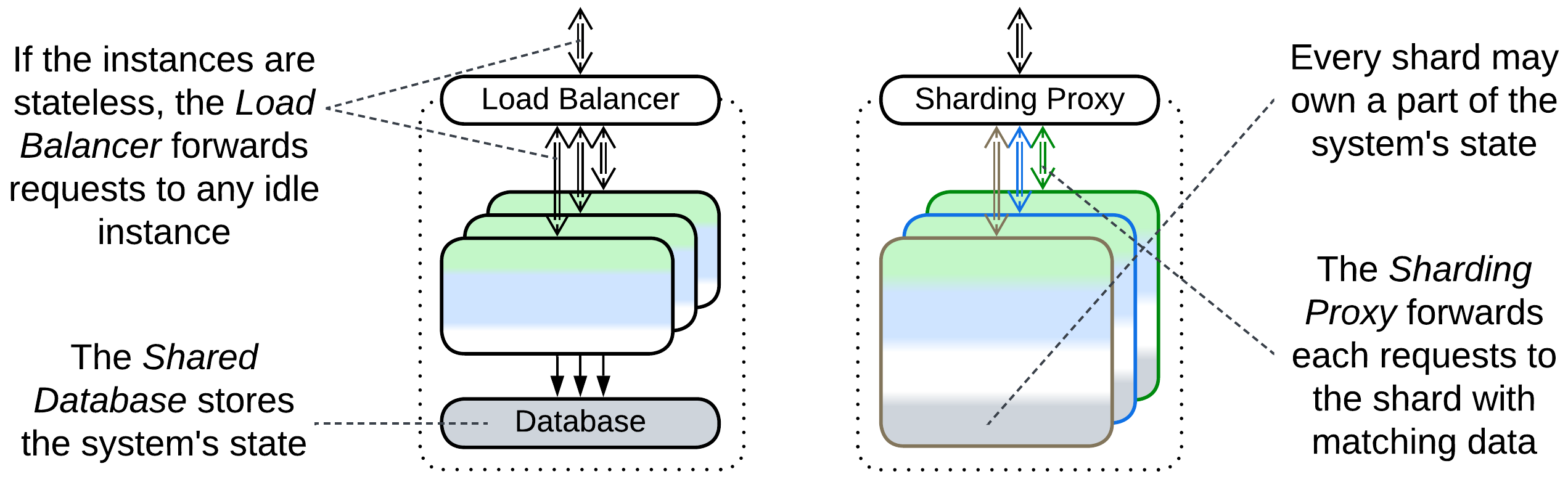 With scaled services there are multiple instances of a service. In most cases they share a database (though sometimes the database may be sharded or replicated together with the service that uses it) and get their requests through a Load Balancer or Sharding Proxy.