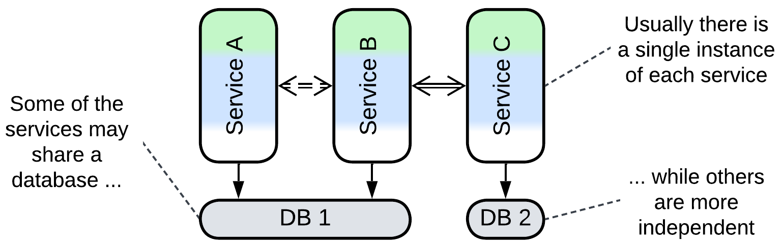 Multiple instances of an individual service may be deployed to improve throughput of the system. However, such a case will likely need a Middleware or Load Balancer to distribute interservice requests among the instances and a Shared Repository to store and synchronize any non-shardable (accessed by several instances) state.