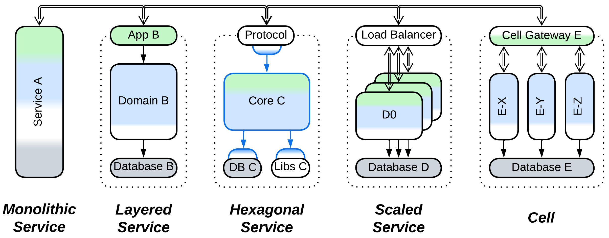 - Each service can be implemented by Layers (making a layered service), Hexagonal Architecture, or a Cell.