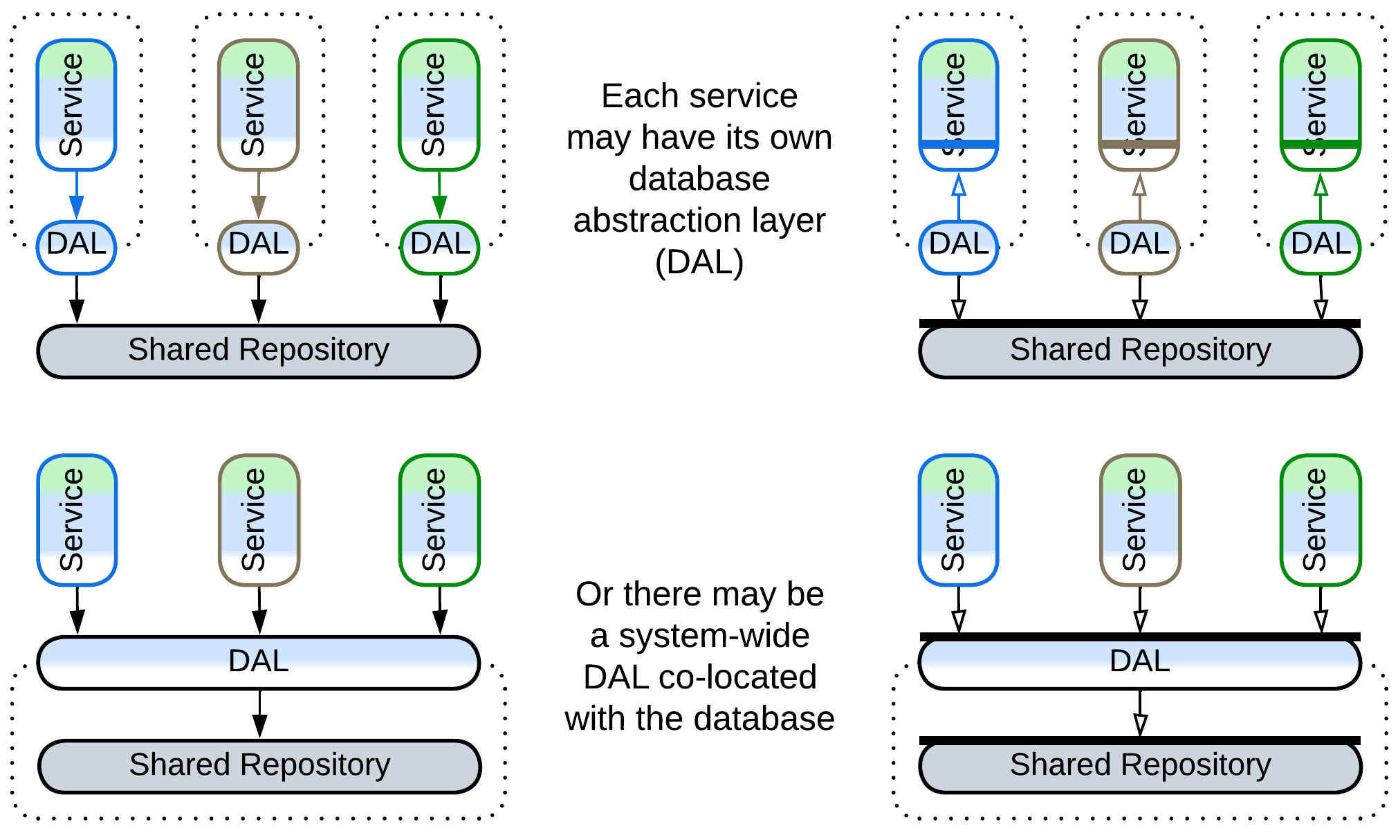 The dependency on repository technology and a data schema is dangerous for long-running projects as both of them may need to change sooner or later. Decoupling the code from the data storage is done with yet another layer of indirection which is called a Database Abstraction Layer (DAL), a Database Access Layer [POSA4], or a Data Mapper [PEAA]. The DAL, which translates between the data schema and database’s API on one side and the business logic’s SPI on the other side, may reside inside each service or wrap the database: