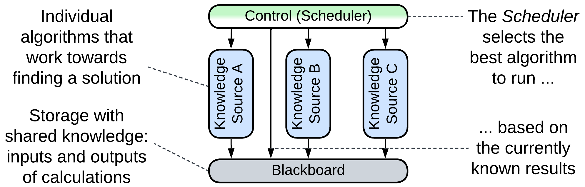 Blackboard [POSA1, POSA4] was used for non-deterministic calculations where several algorithms were concurring and collaborating to gradually build a solution from incomplete inputs. The control (Orchestrator) component schedules the work of several knowledge sources (Services) which encapsulate algorithms for processing the data stored in the blackboard (Shared Repository). This approach has likely been superseded by convolutional neural networks.