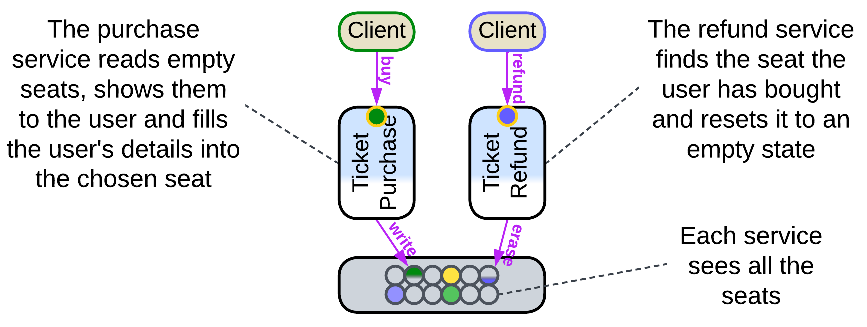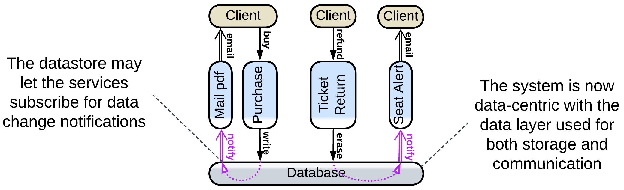Finally, some (usually distributed) datastores implement data change notifications. That allows for the services to communicate through the datastore in real-time, removing both the need for an additional Middleware and interdependencies for the services. Such a system follows the Shared Repository pattern of [POSA4] which was rectified as Space-Based Architecture [SAP, FSA]. In our example, the available seats notification service subscribes to changes in the seats data in the database – this way it does not need to be aware of the existence of other services at all. We can also move the email notifications logic of the ticket purchase service into a separate component which would track purchases in the database and send a printable version of each newly acquired ticket to the buyer’s email address which can be found in the ticket details in the database.