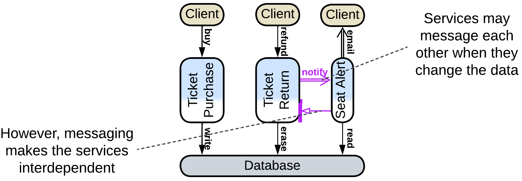 Services usually need to coordinate their actions. Commonly, services with a shared database rely on a messaging Middleware for communication. Users of our ticketing system will want to be notified (through email, SMS or an instant message) when a free seat that they are interested in appears. We’re not going to complicate either of the existing services by integration with instant messengers, so we will create a new notification service, which must track each returned ticket to see if any user wants to buy it. This is easily implemented by the return service publishing and the notification service subscribing to a ticket return event, mixing in a bit of choreography into our data-centric backend.