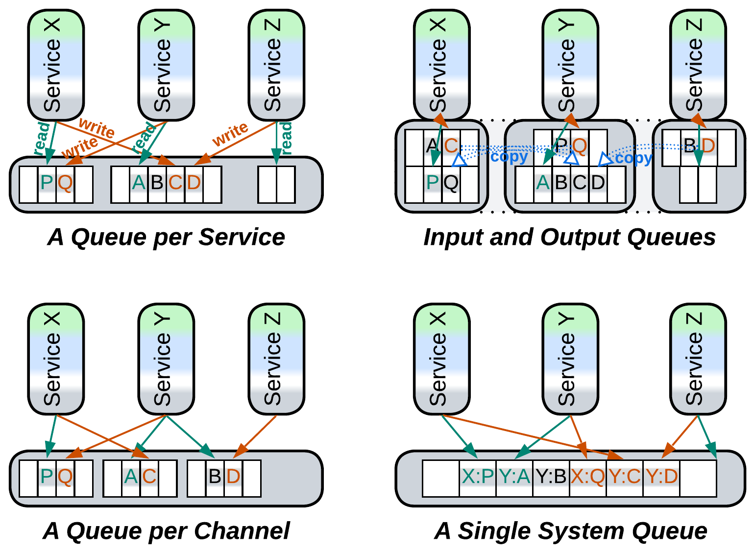 The other, not as obvious, use case for shared data is messaging, which is implemented by the sender writing to a (shared) queue (or log) while the recipient is waiting to read from it. Queues can be used for any kind of messages: request/confirm pairs, commands, or notifications. Each service may have a dedicated queue (either input for commands mode or output for notifications), a pair of queues (messages from the service’s output are duplicated by an underlying distributed Middleware to input queues of their destinations), or there may be a queue per communication channel, or a single queue for the entire system (or a global queue per message priority) with each message carrying destination id (for commands) or topic (for notifications).