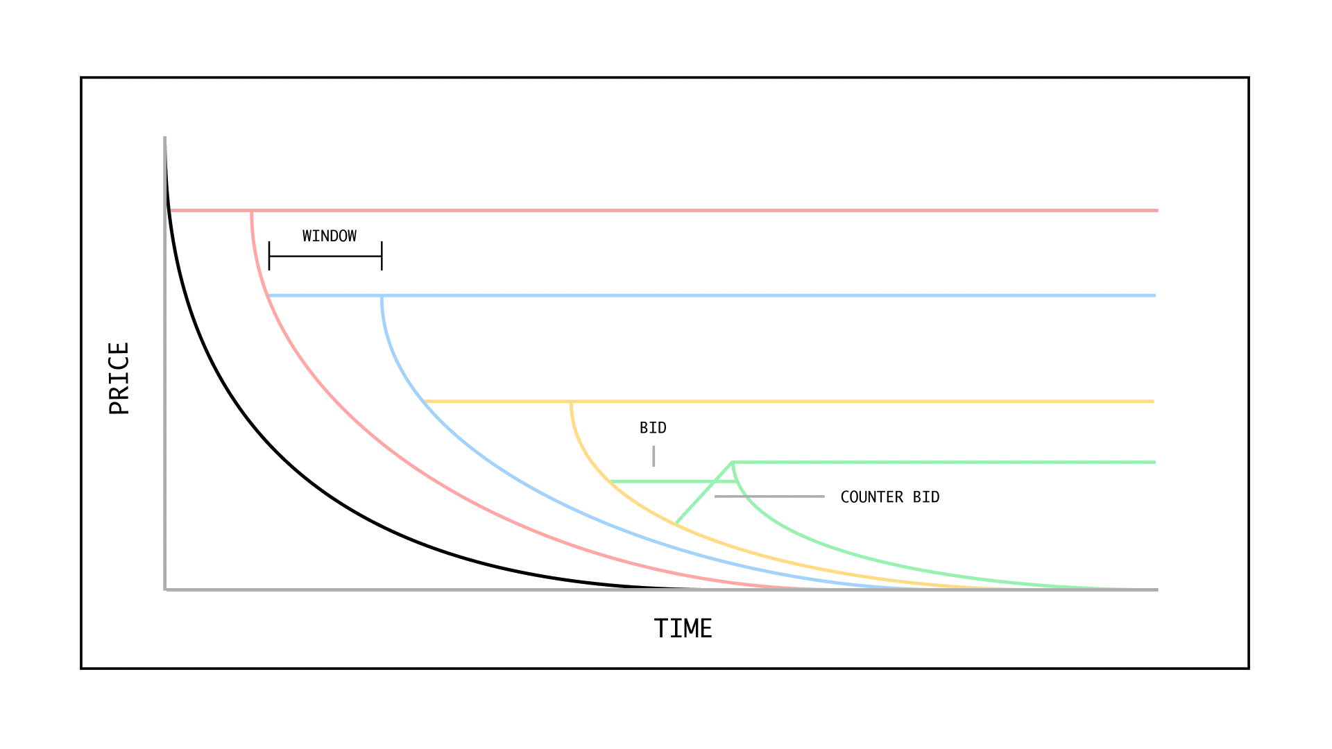 Composite decay resets a point on the curve to it's current coordinates normalising the slope, making price decay inversely proportional to bid activity. This occurs whenever an auction "window" or "tranche" is initialised, which is when a participant submits a bid; which must be equal or greater than the current scalar price.