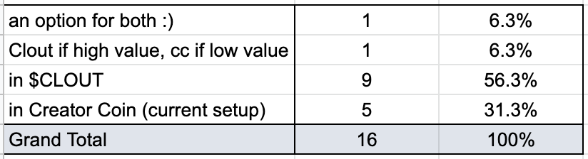 I did my best to get as many responses as possible, and I thank those who recloted the survey. However, I'm not satisfied with the volume of responses since I would like more people in the community to participate in making a decision. On the other hand, and as mentioned in the past would be great to count on the input of someone from the core team around this matter (@diamondhands0, @maebeam, @lazynina, @bluepartyhat, @redpartyhat) PS: If we change the vote of @teambrixmusic to ('in Creator Coin') as per her comment, the final result would be: Best regards, |