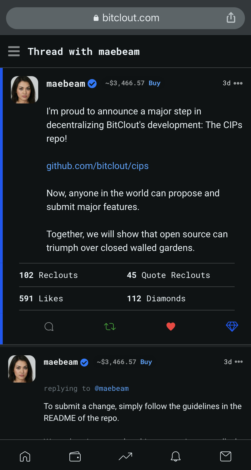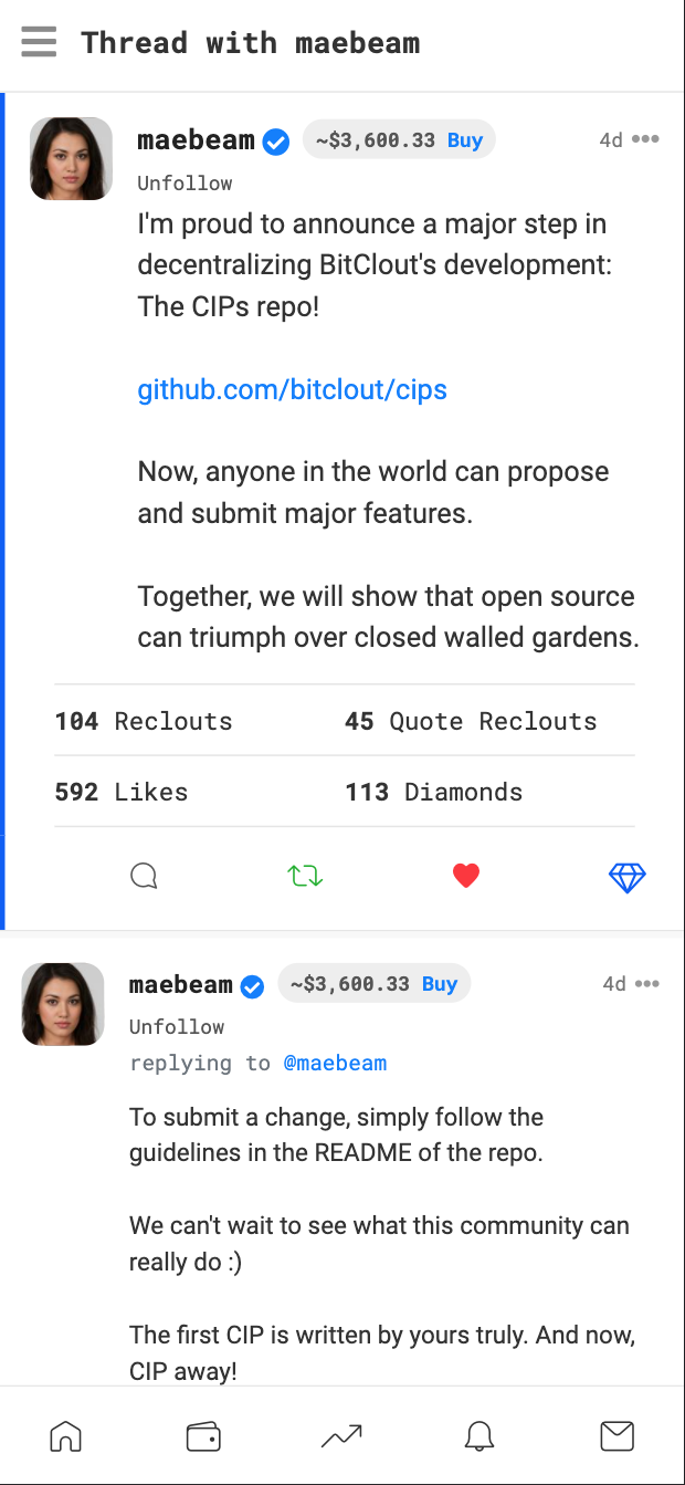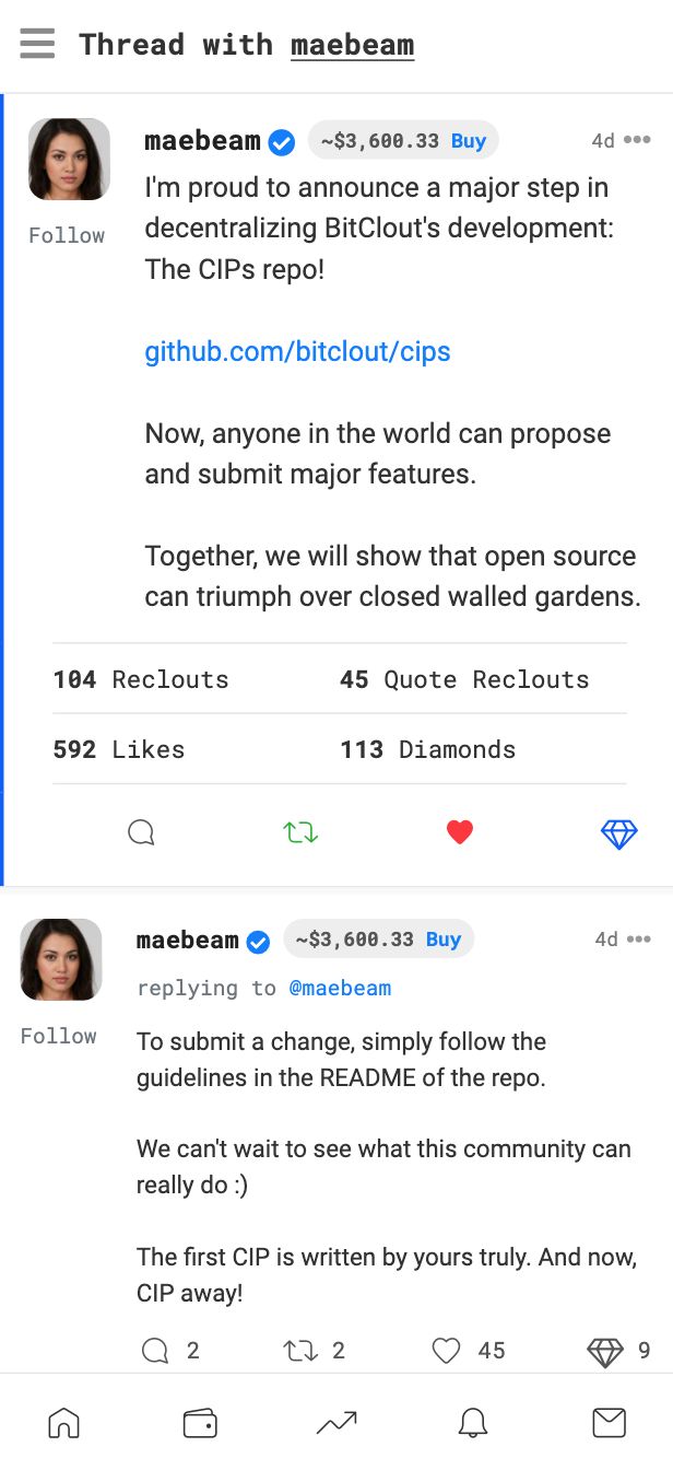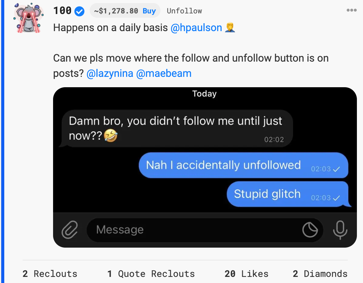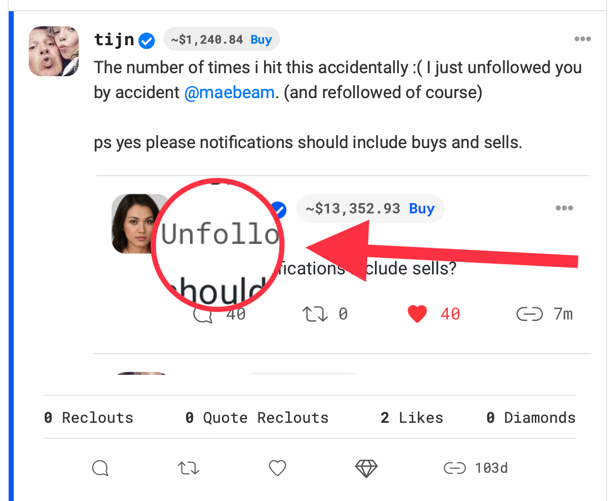 Unfollowothers directly from their profile. This behavior will allow us to avoid accidentalUnfollowclicks, as this is more of a destructive action thanFollowIMO.⭐ As a bonus, I propose anywhere a Creator username is listed, we make that link to their profile. Starting with the 'thread' page title.