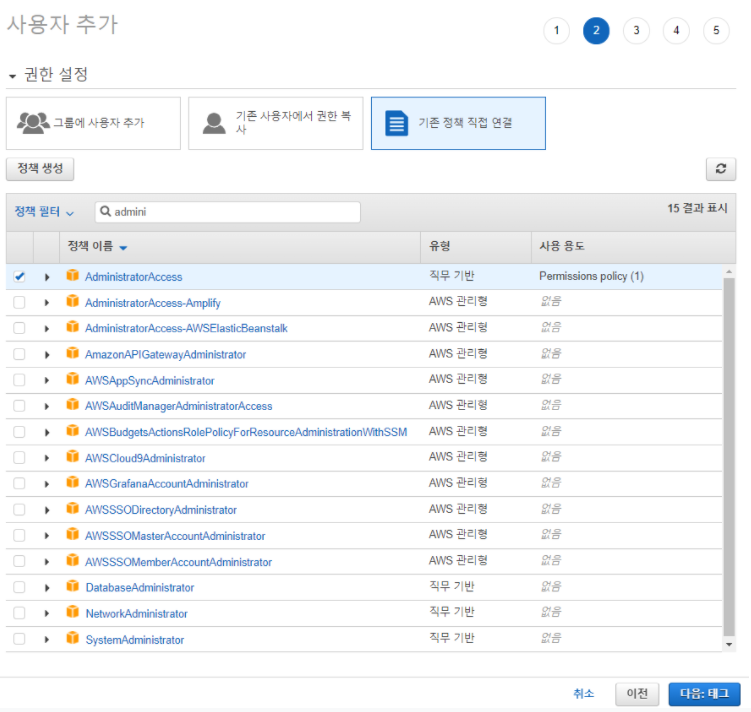์ฌ๋ฌ ์ต์ ์ด ๋์จ๋ค. ์ฌ์ฉํด์ผํ ์ ์ฑ ๋ค์ ์ด๋ฏธ ์ ํ๋ค๋ฉด ํด๋น ์ ์ฑ ์ ์ฌ์ฉํ๋ค. ์๋ชจ๋ฅด๊ฒ ๋ค๋ฉด AdministratorAccess์ ์ ํํ๋ค. ์ต๊ณ ๊ถํ์ ๊ฐ์ง ์ ์ฑ ์ด๊ธฐ ๋๋ฌธ์ ํ๊ณ ์ถ์ ๊ธฐ๋ฅ์ ๋ชจ๋ ์ด์ฉํ ์ ์๋ค. ์ ์ฑ ์ ์ ํํ๋ค๋ฉด ๋ค์์ผ๋ก ๋์ด๊ฐ๋ค.