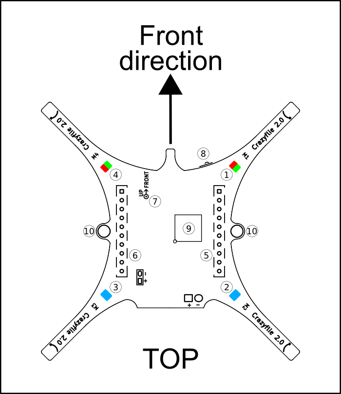 - Power on and all is good but sensors are not yet calibrated: The blue LEDs (2 and 3) are fully lit and the front right LED (1) is blinking red with 2 seconds interval. Put the Crazyflie 2.X on a level surface and keep it absolutely still to calibrate.
