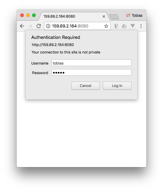 Since Caddy v2 does not allow plain passwords anymore, we have to hash the password using the caddy hash-password command. The resulting password hash for user tobias is JDJhJDE0JGlSeUtsSGthN2pPdTJMckJkQzEycmVXd3NKN3dJd3ZPZC9YOUpwcVE4dndpTEFVWmZMbTUy.