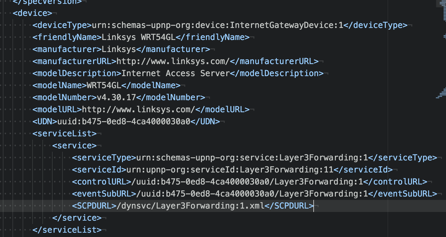 A little about UPnP schemas: The UPnP Forum defines the UPnP template for various profiles. InternetGatewayDevice:1/2 is one of such template. The Document can be obtained here. The IGD Schemas of interest here provide options to open ports, set/get connection types, get external IP, DNS settings, etc.