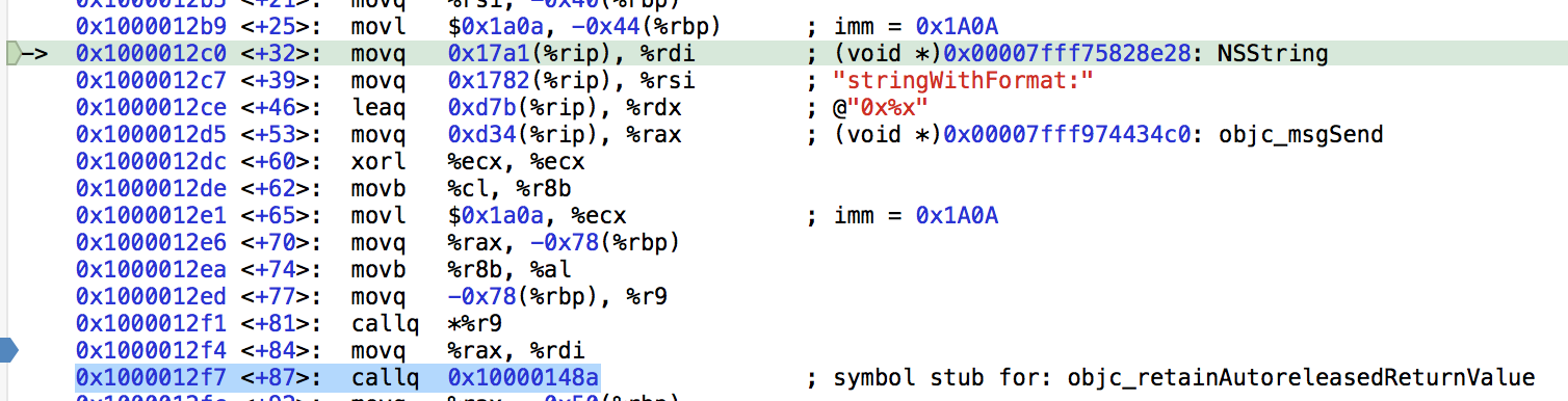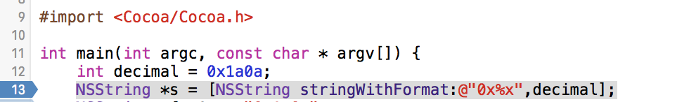 NSString *s = [NSString stringWithFormat:@"0x%x",decimal];0x1000012b9 <+25>: movl $0x1a0a, -0x44(%rbp) ; imm = 0x1A0A