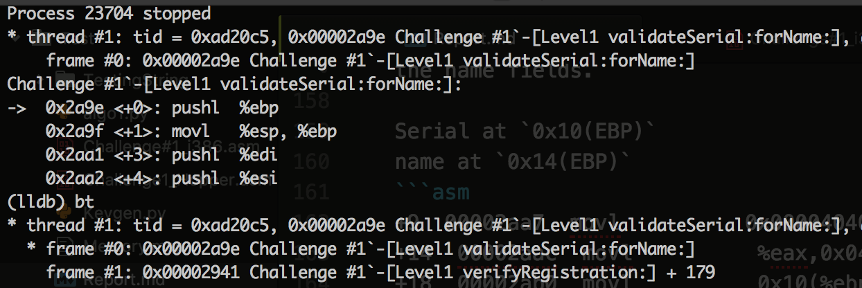 The next important function was validateSerial:forName: with two arguments (id)nameField and (id)serialField. From the function name and set of arguments passed, this looks like the function which validates the serial with the corresponding name. Breakpointing at the start of the function and using bt in lldb, I was able to get the call stack as below: