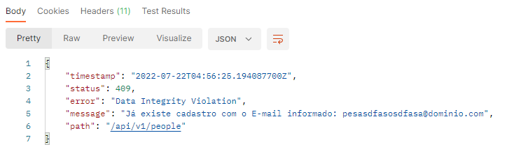 Resposta de cadastro de pessoa com violação de integridade ao tentar cadastrar nova pessoa com Email já existente: