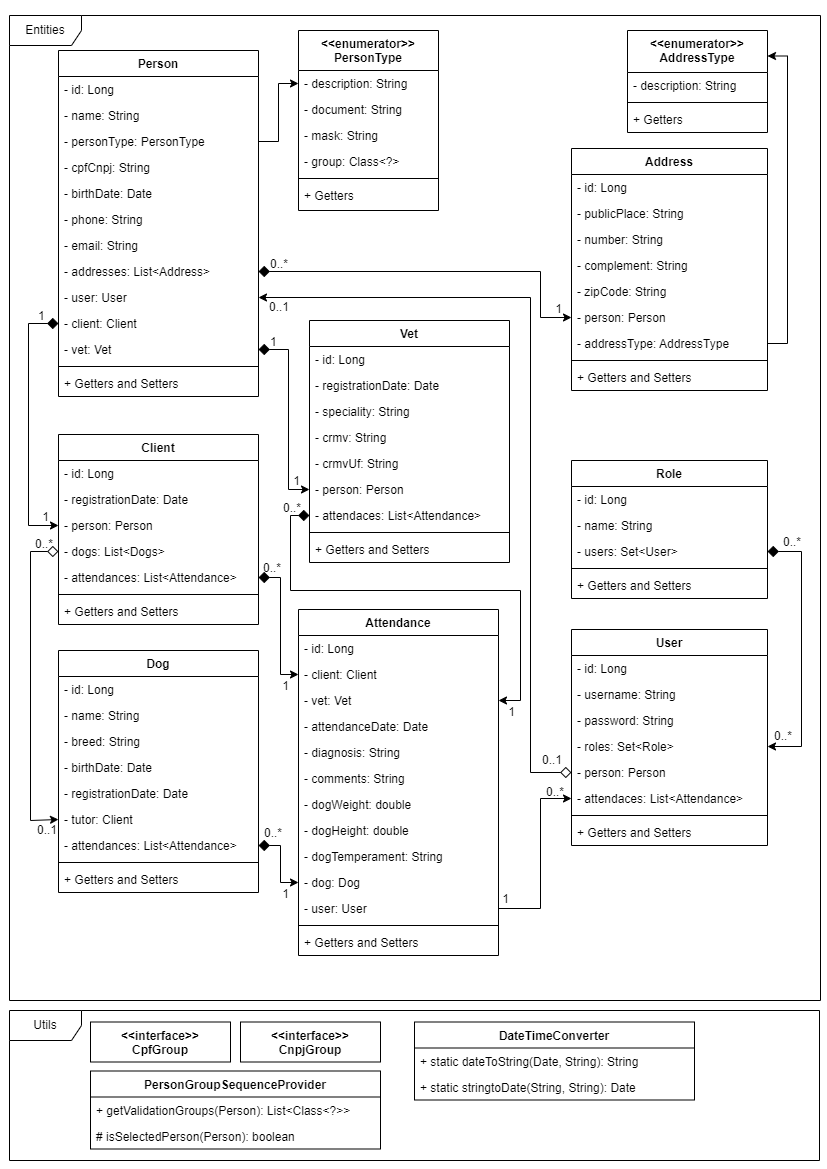 Personpara as classesClienteVet. Assim é possível que uma pessoa seja cadastrada como cliente e veterinário sem necessitar colocar dados cadastrais pessoais, como o CPF/CNPJ, data de nascimento ou o endereço novamente, e pode ser aproveitada evoluções do projeto, como cadastro de funcionários; - Criado a entidade