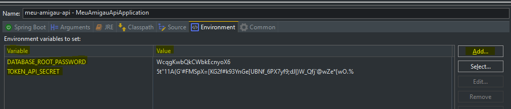 - Variáveis de ambientes que devem ser setadas no sistema ou na IDE para funcionamento adequado da aplicação: