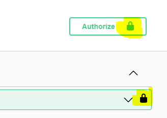 4- Para realizar a autorização de acesso aos endpoist basta clicar no botão "Authorize" ou no ícone de cadeado que aparece em frente aos endpoints que exigem autorização