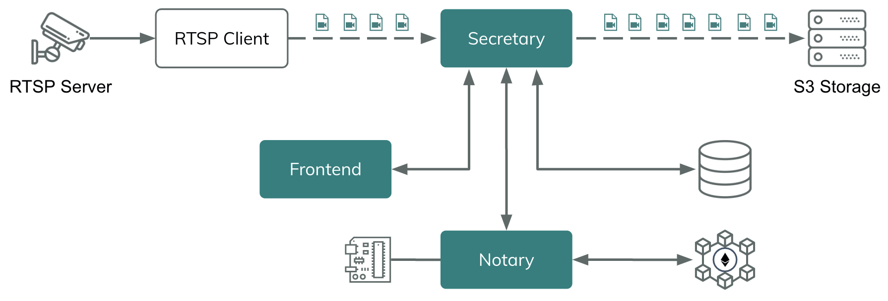 - Secretary is a proxy agent that (a) intercepts the RTSP client output files, (b) calculates hashes for each file, (c) sends the files to the S3 storage and (d) sends the calculated hashes, including file name, to the Notary service.