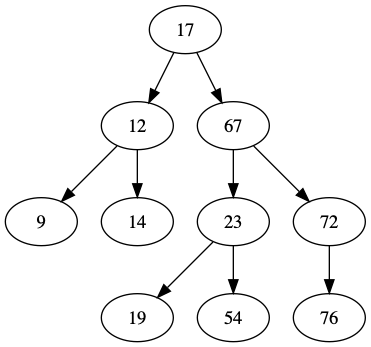 Depth first search, pre-order traversal: 17 12 9 14 67 23 19 54 72 76