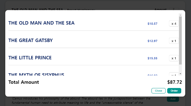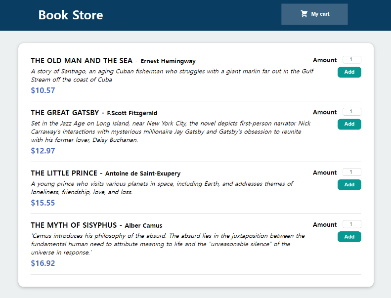 ✅ 원하는 책의 개수를 선택하고 add 버튼을 누르면 장바구니에 추가