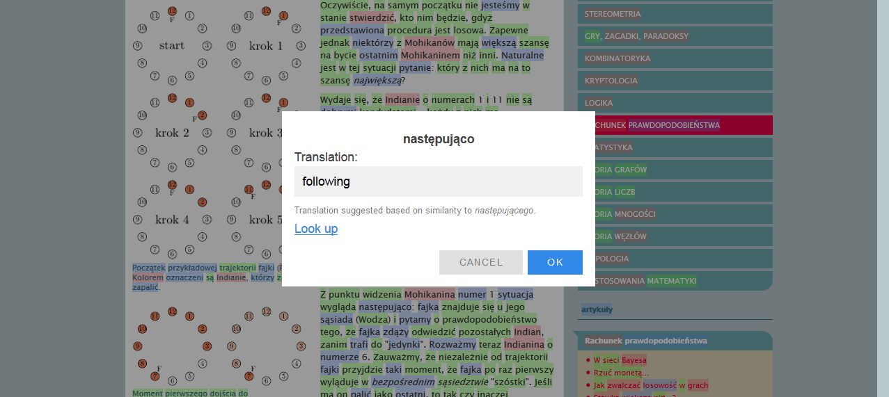 Wordology is a browser add-on for Chrome and Firefox intended to help turn your foreign-language reading from homework into a natural part of your routine. Inspired by Lingq and FLTR, Wordology allows you to add translations for individual words and display them with a simple mouse-over. Words are color coded: green for known words, and red for unknown, helping visualize your progress. In addition, Wordology's "Smart Matching" heuristics will automatically detect variant forms of words such as plural nouns or conjugated verbs, saving you from having to add every single form of a word.