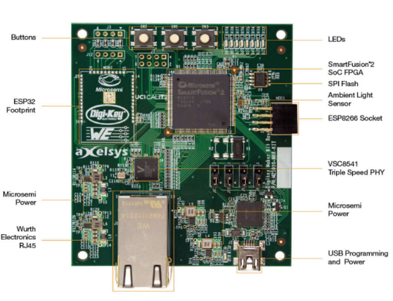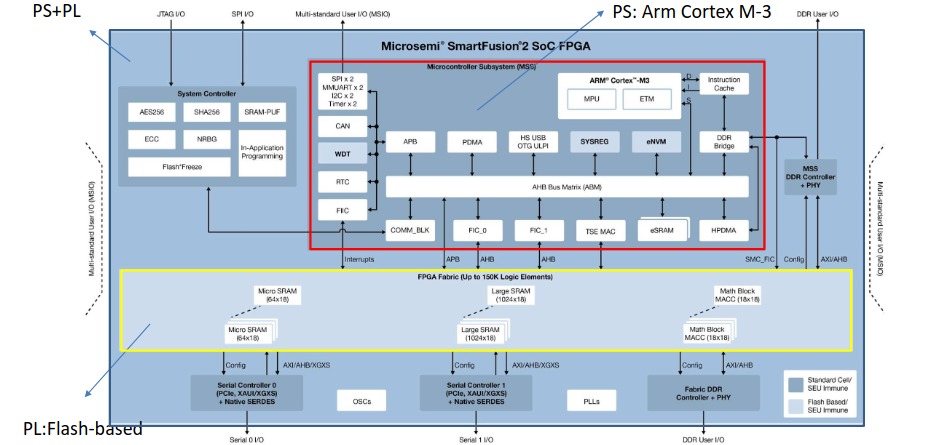 Microsemi is a U.S. based semiconductor manufacturer developing and fabricating analog mixed-signal devices. Smartfusion2 is an SoC FPGA containing an embedded ARM Cortex M3 (166MHz) with Instruction Cache and on-chip eSRAM and eNVM. The programmable logic depending on the chip can contain from 5 thousand up to 150 thousand logic cells. Various I/O peripherals such as DMA, GPIO or SPI are also implemented making the FPGA versatile.