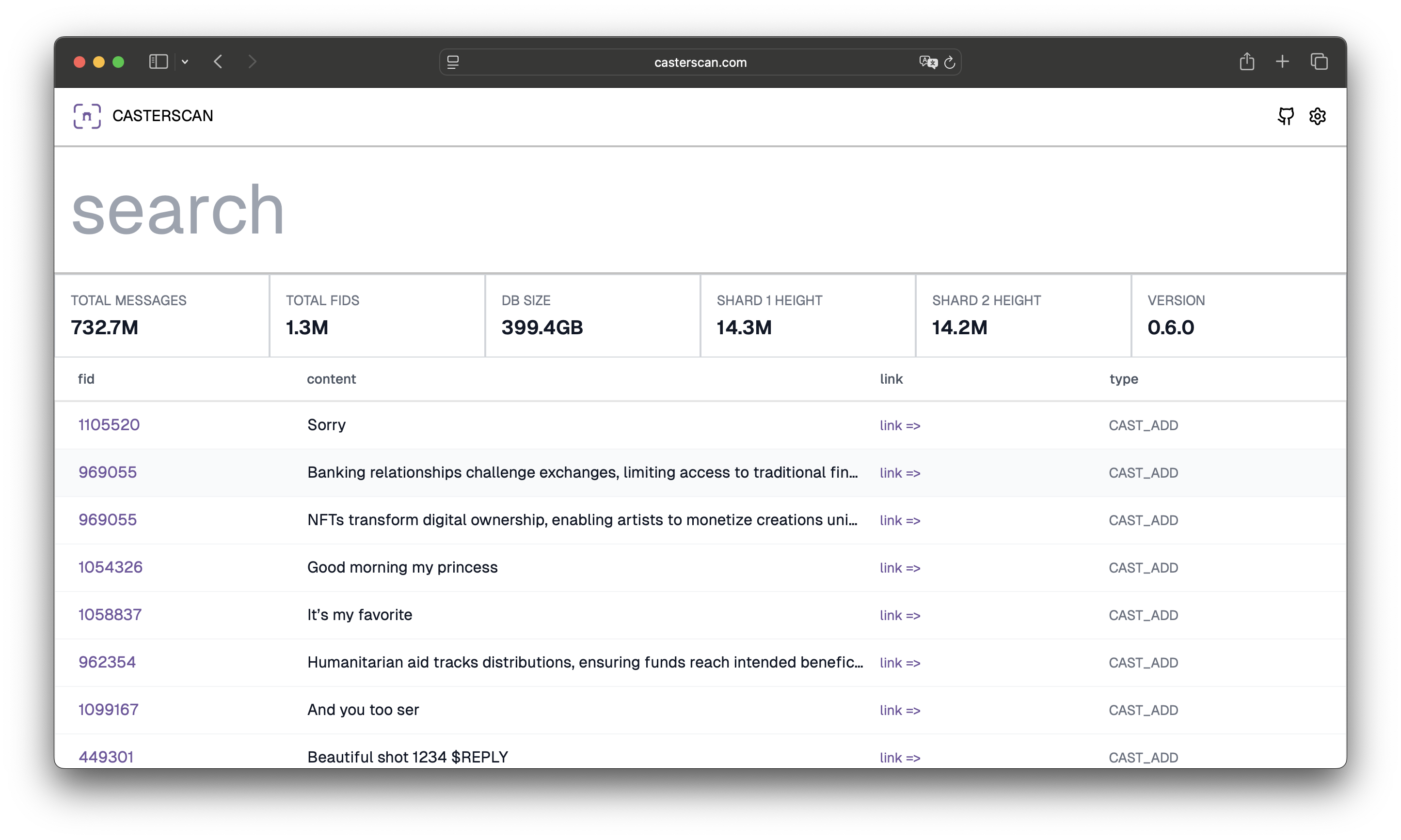 Casterscan is a block explorer for Farcaster. It currently lets you view: