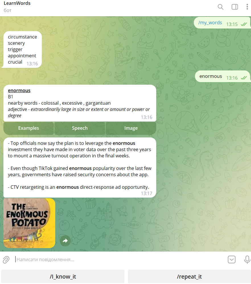 - Open and work with bot: https://t.me/Learn_Words_En_Bot