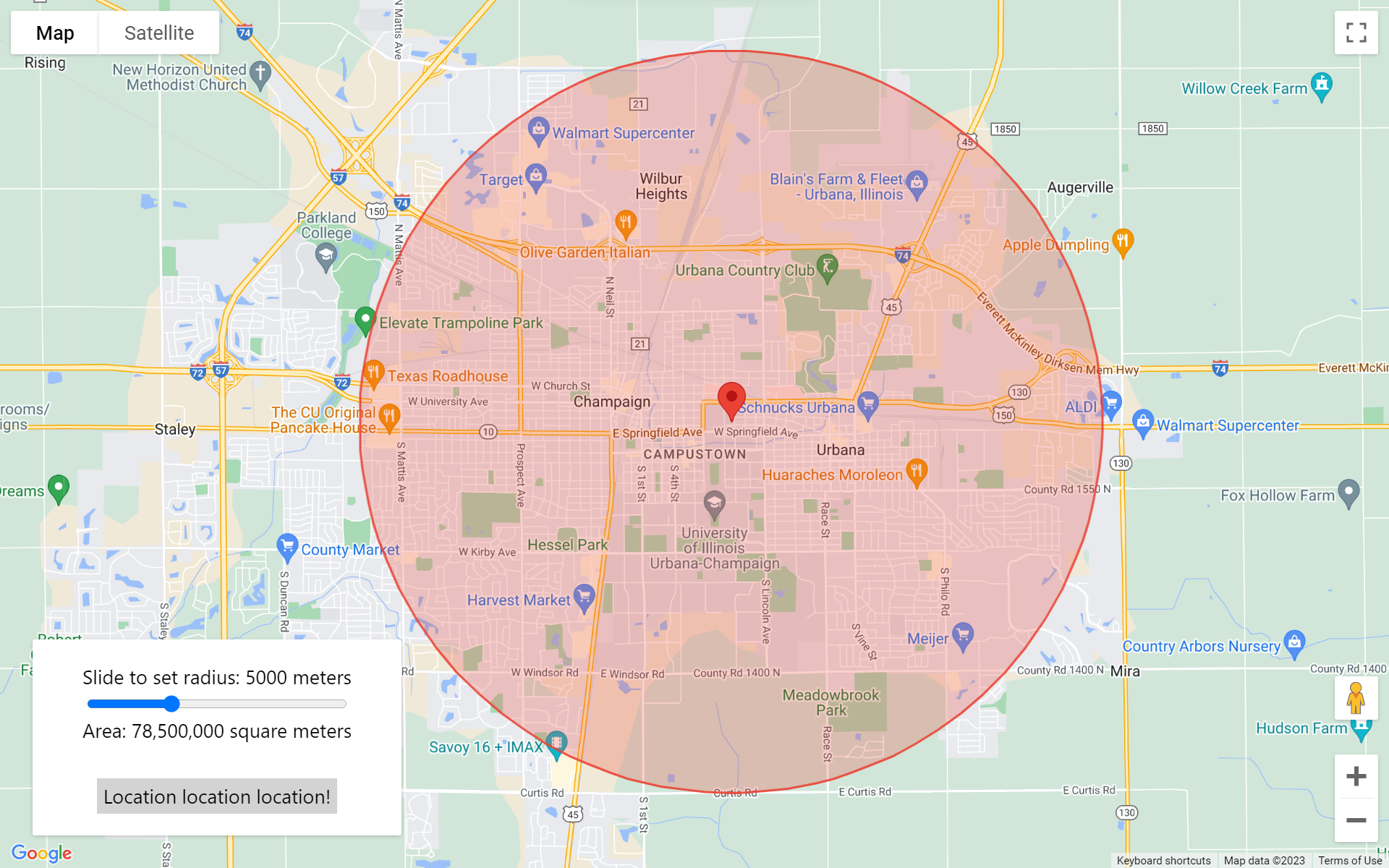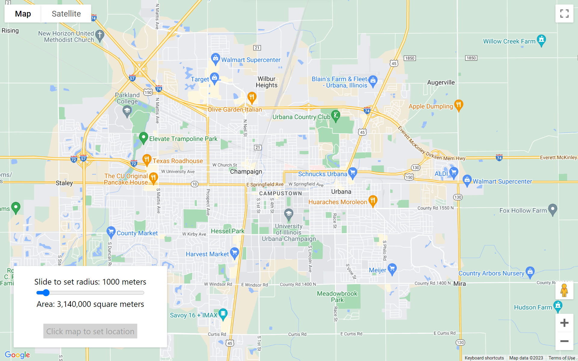 Select an area to analyze by clicking on the map to set a location, and using the slider to set a radius.