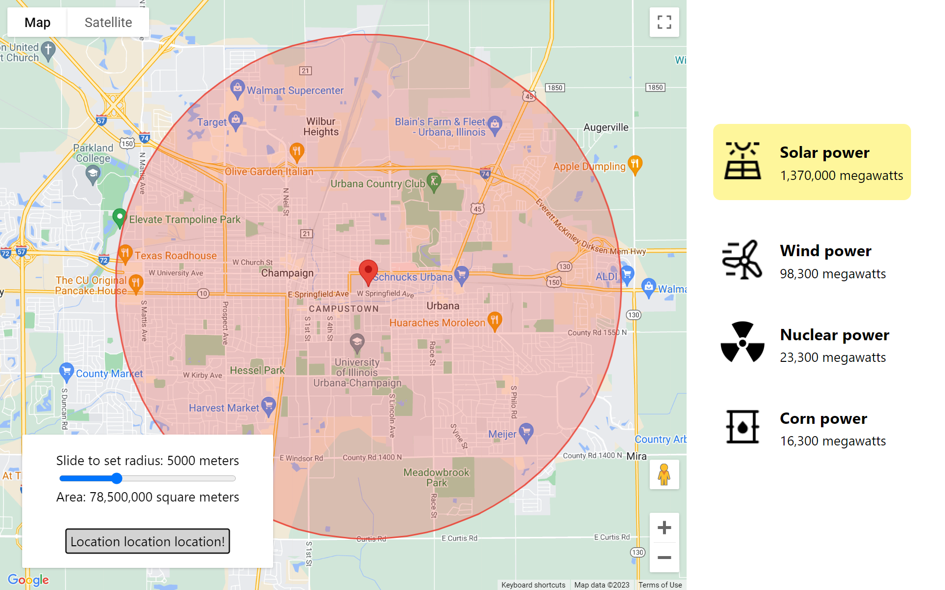 Click the Location location location! button to predict the amount of renewable energy the selected area can produce, out of four common renewable energy sources, and a ranking of the recommended sources for maximum efficiency.