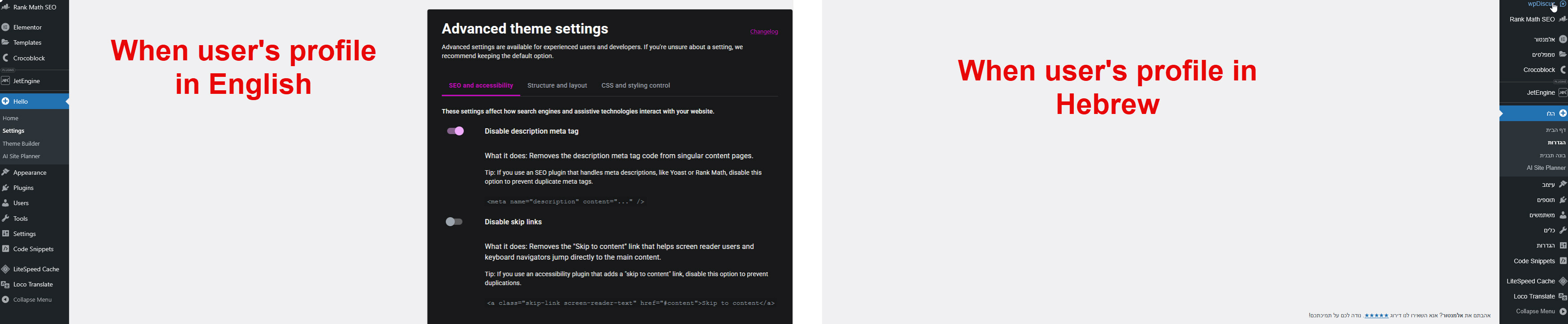 Hi Since Version: 3.4.1 the new Advanced theme settings page not working in RTL languages This is not fixed with Version: 3.4.2 domain/wp-admin/admin.php?page=hello-elementor-settings https://upit.co.il/images/d509d3529ecda3b32d7c9a401d64e161.jpg