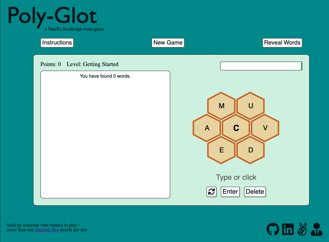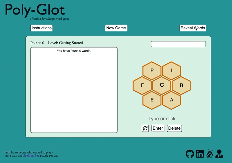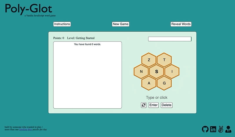 To solve this issue, I decided to build Poly-Glot, a simple JavaScript application that generates new Spelling Bee-style puzzles algorithmically. Along the way, I became much more comfortable with Vanilla JavaScript and Object Oriented Programming, and I got to learn a little bit about dictionary design, too.