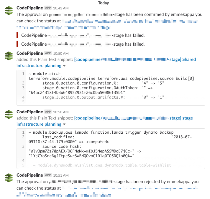 terraform-aws-cicd Introduction Terraform modules to support various CI/CD scenarios based on AWS services (like CodeBuild and CodePipeline) and integrations with Slack Screenshots Installation and usage Please take a look at each README.md files inside each module