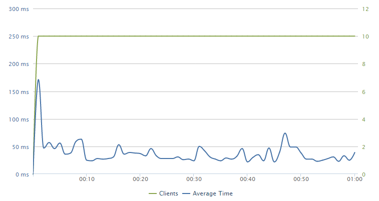 Loader IO reports an average response time of 33 msec with 10 concurrent clients. The distribution of response time is shown in the graph below: