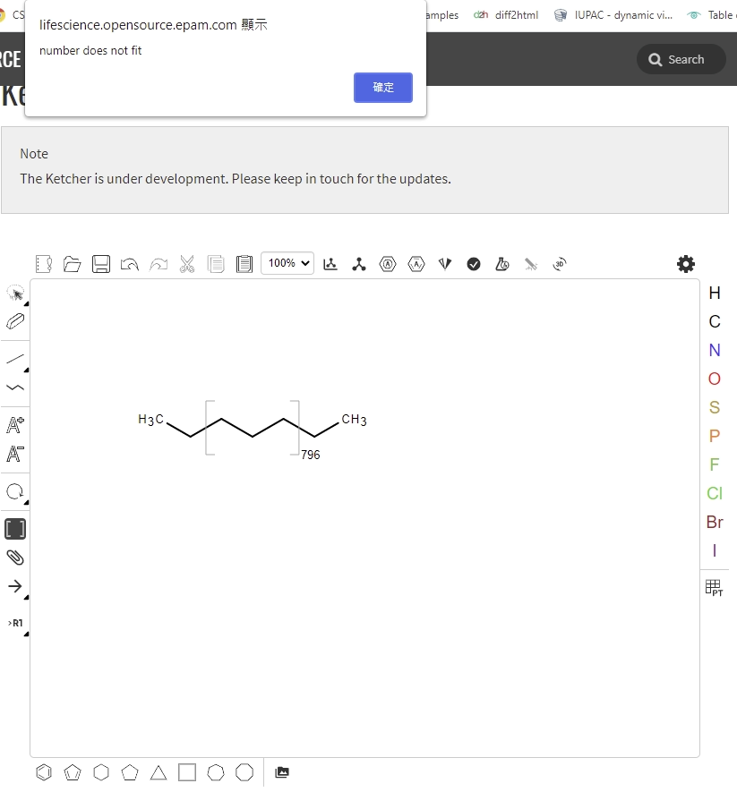 When I tried to draw something with S-Group, e.g. 796, and press the "Save As..." button, I got the message "number does not fit". In case I did something wrong in my environment, I tried on Ketcher 2.2 Standalone demo site and got the same result (see image). I would like to know if I miss any or this is not the case supported by Ketcher 2 ? Thank you. |