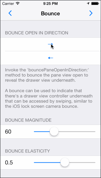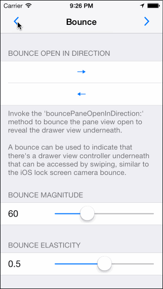 method. If you have more than one drawer view controller, use the bouncePaneOpenInDirection: