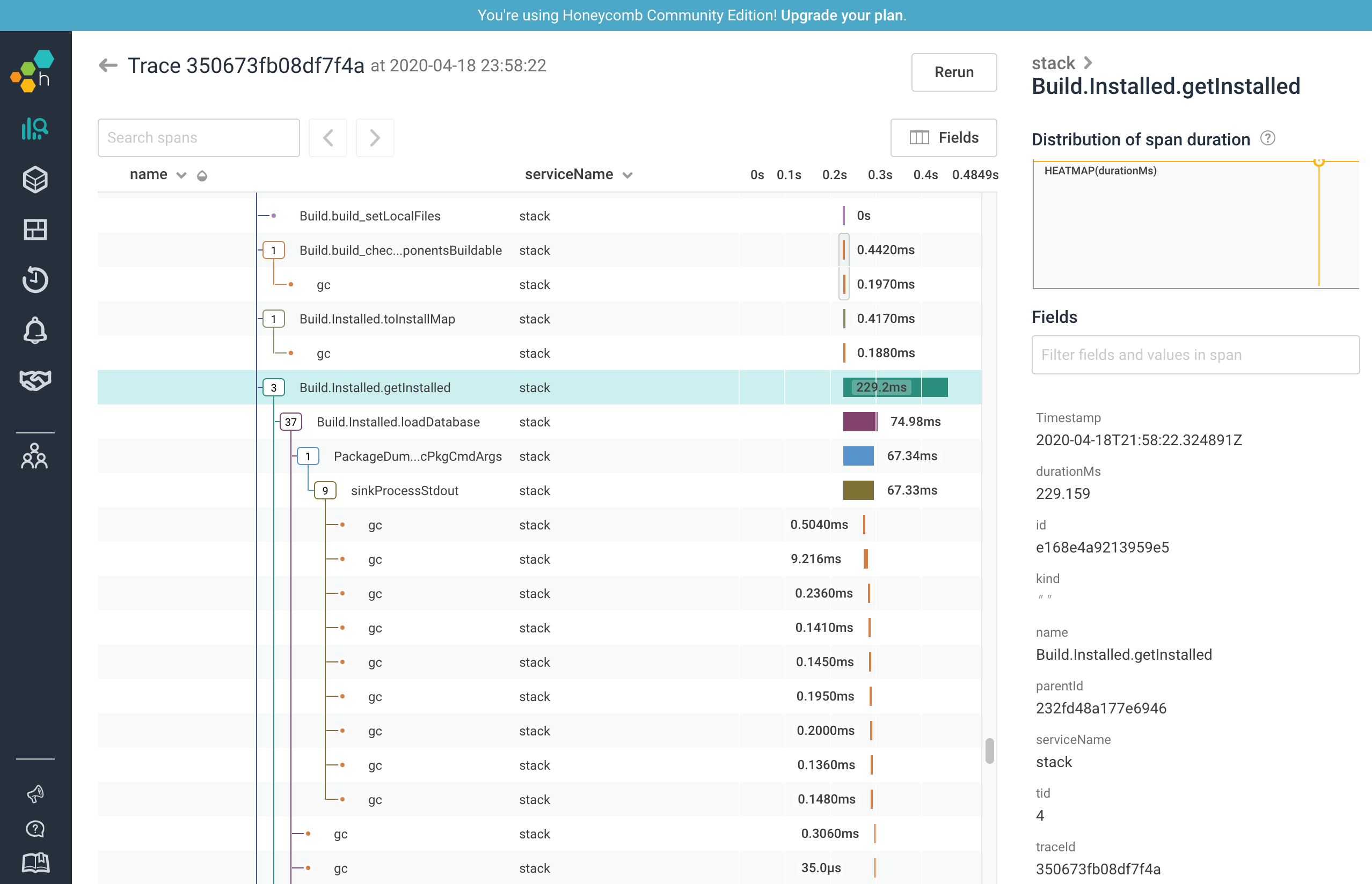 Here is how a trace of stack install looks loaded in Honeycomb: