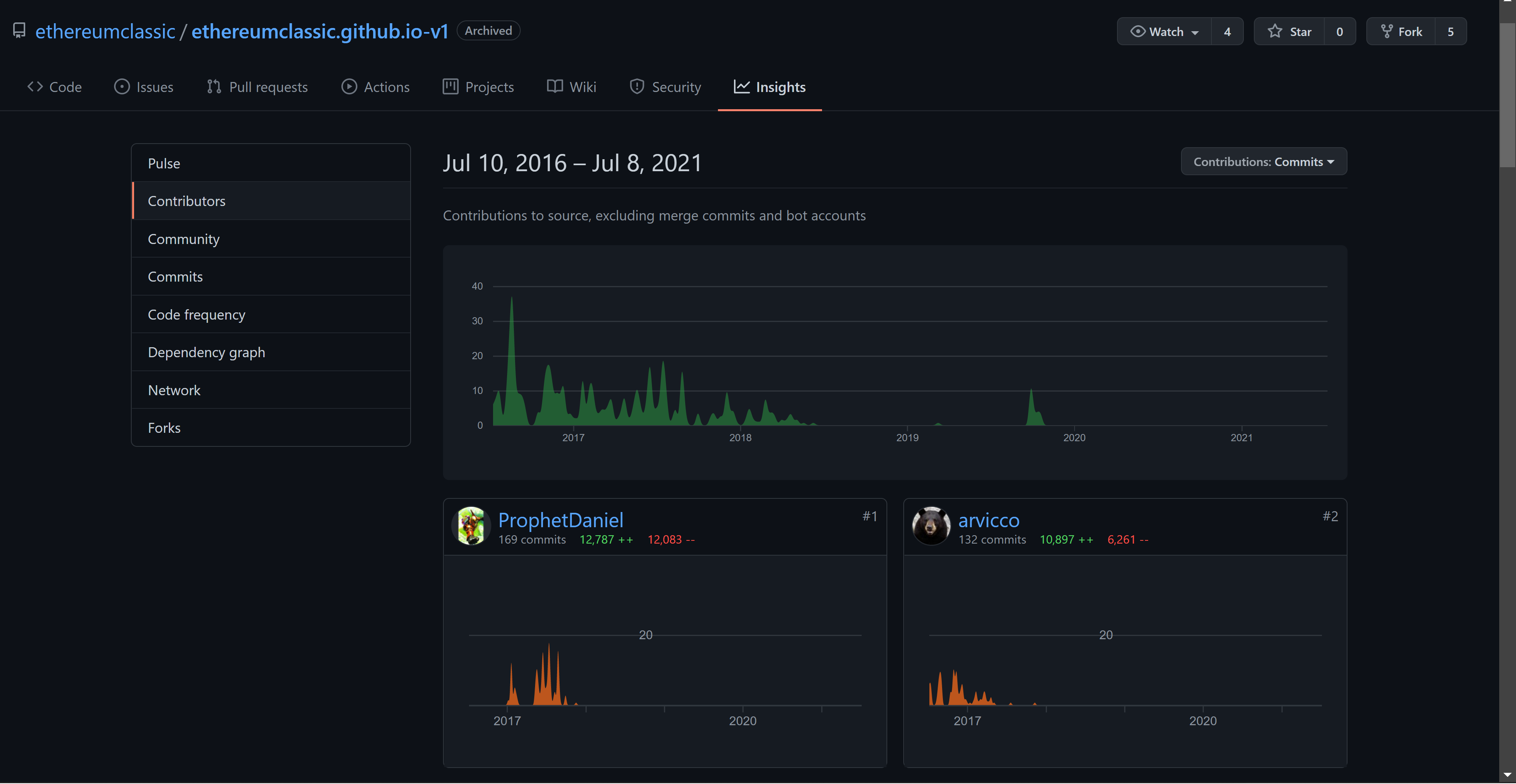 Okay, I think I understand what's going on now. It's not that your commits aren't showing up or that your contributions were deleted; it's just that your account isn't appearing on the ranking on contributions page. You are appearing in the contributions sidebar in that repo, just not on the main page, which makes me think... I checked the old commits, and they were committed by Author: Prophet Daniel prophetdaniel@ethereumclassic.org Notice here that your account name isn't linkable. Compare that to one of your recent commits Committer: Prophet Daniel daniel_the_prophet@protonmail.com Are you using the same email for your github account? This is probably be what is causing the link to break, and therefor not be listed on the contributors page (which only shows known github users I believe)? Related issue: https://stackoverflow.com/questions/15289768/github-commits-arent-recorded-in-the-your-contributions-calendar I don't want to reach out to github support immediately because without diagnosing the problem I don't see how getting those logs are going to help, and it will be wasting their time unless we have a good reason to access them. Btw, their response about not seeing your commits is related to the new repo, which indeed does not have any of your commits as you did not commit to that repo -- so perhaps you can ask them the same question about the v1 repo, explain the email thing. I'm fairly sure it'll have something to do with the email address you used. |