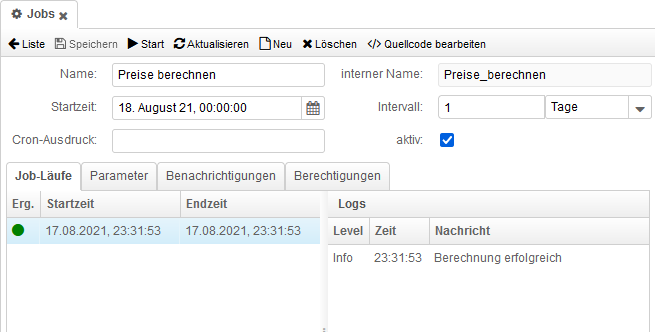 Jede Ausführung eines Jobs wird im Reiter Job-Läufe protokolliert. Dabei wird die Start- und Endzeit des Jobs sowie das Ergebnis vermerkt. Zusätzliche Log-Ausgaben des Jobs werden beim Anklicken des Job-Laufs rechts unter Logs dargestellt.