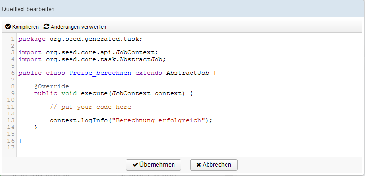 Durch Übernehmen werden die Änderungen übernommen und der Dialog geschlossen. Vorher wird der Quelltext testweise kompiliert. Treten dabei Fehler auf, wird der Dialog nicht geschlossen.