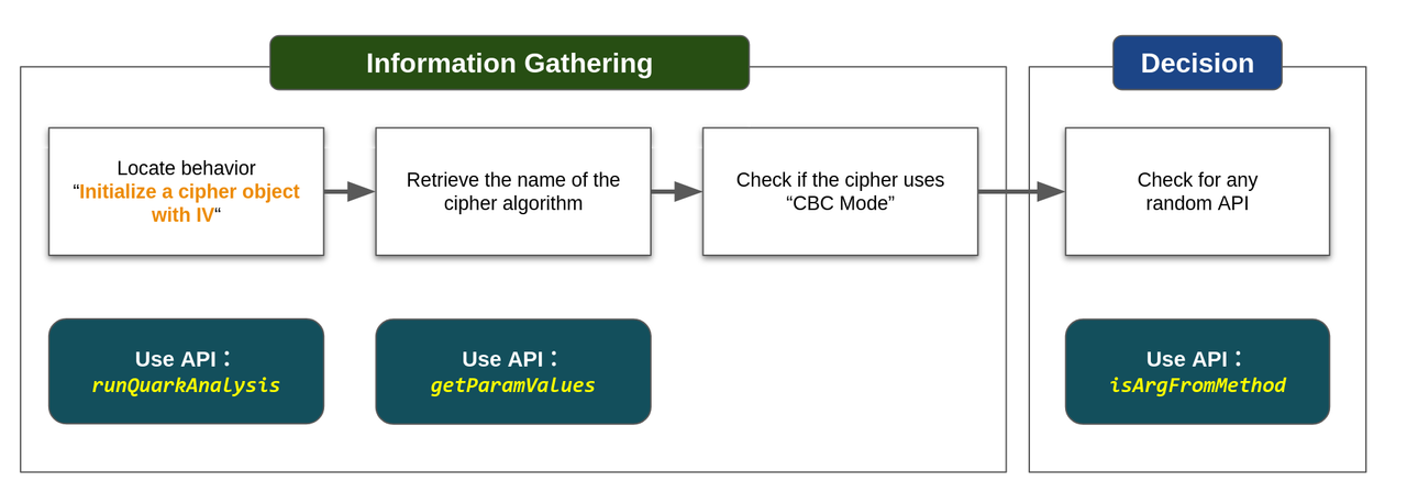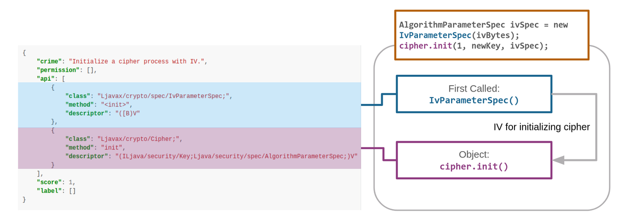 | 29 | +To begin with, we created a detection rule named ``initializeCipherWithIV.json`` to identify behaviors that initialize a cipher object with IV. Then, we use API `behaviorInstance.getParamValues()` to check if the cipher object uses CBC mode. |