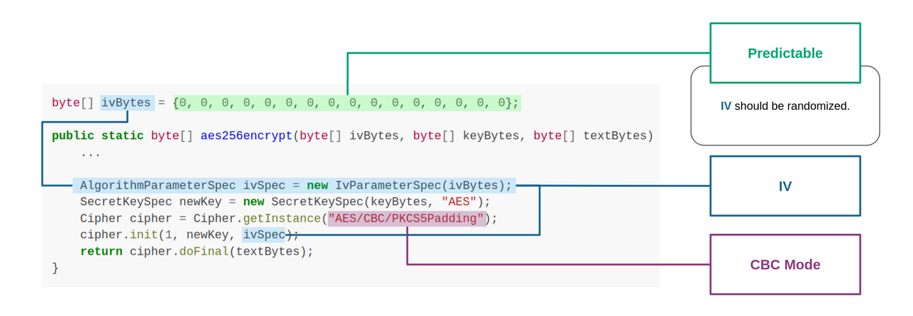 | 31 | +Finally, we use API ``behaviorInstance.isArgFromMethod(targetMethod)`` to check if any random API is applied on the IV used in the cipher object. If **NO**, it could imply that the APK uses a predictable IV in CBC mode cipher, potentially leading to a CWE-329 vulnerability. |
