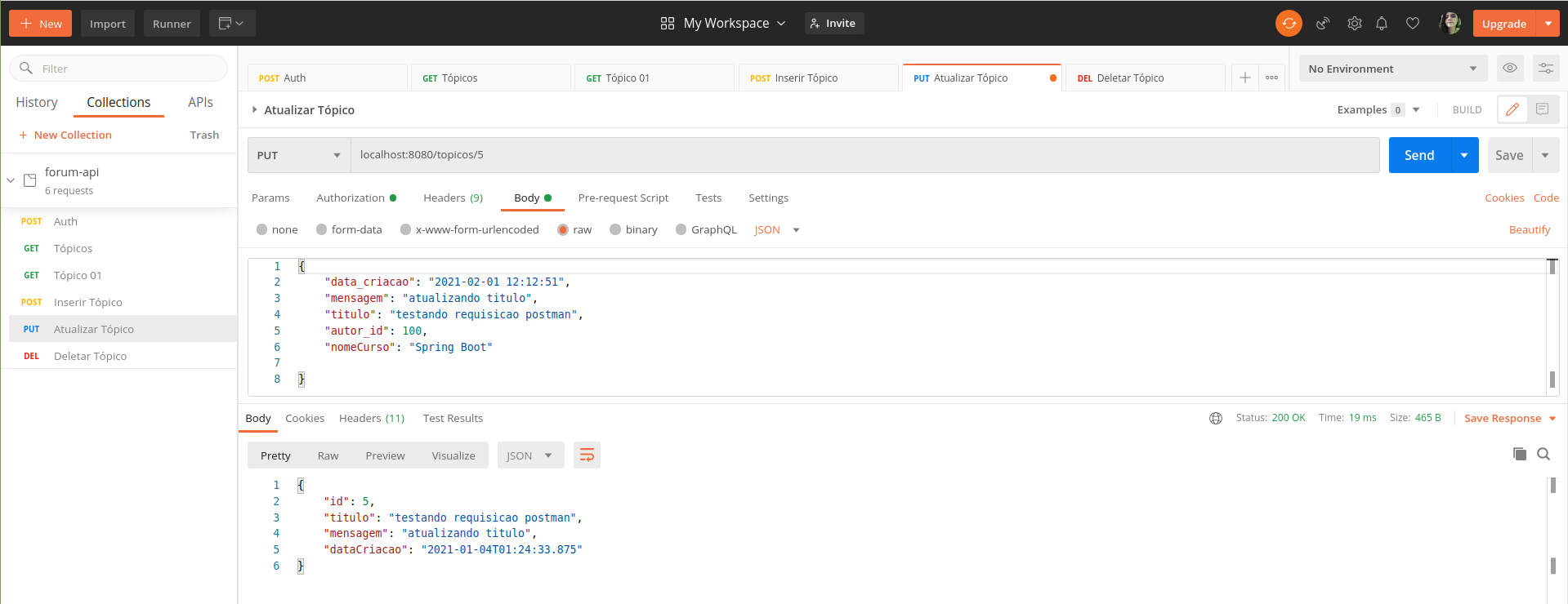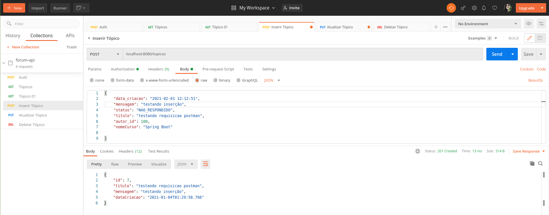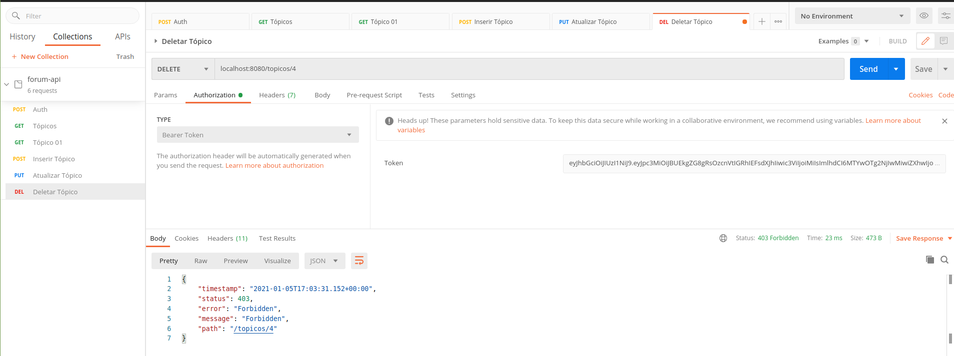 $ git clone https://github.com/ev1illyn/forum-spring-rest-api.git/forum-spring-rest-api$ mvn -DskipTests=true clean package/forum-spring-rest-api$ sudo docker build -t img-alura/forum ./forum-spring-rest-api$ sudo docker images/forum-spring-rest-api$ sudo docker run -d -p 8080:8080 -e SPRING_PROFILES_ACTIVE=prod -e FORUM_DATABASE_URL=jdbc:h2:mem:alura-forum -e FORUM_DATABASE_USERNAME=sa -e FORUM_DATABASE_PASSWORD= -e FORUM_JWT_SECRET=123456 img-alura/forumFor further reference, please consider the following sections: