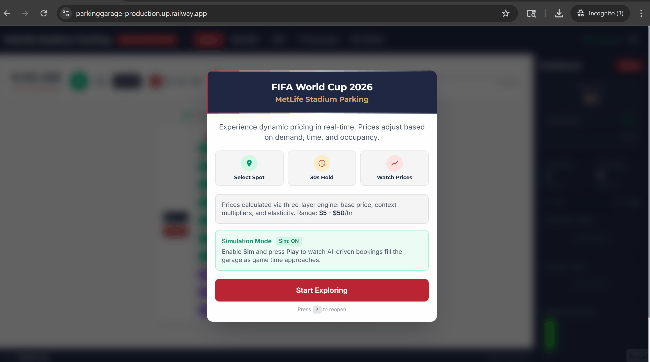 Interactive demo showcasing a revenue-maximizing variable pricing system for a parking garage, themed around FIFA World Cup 2026 at MetLife Stadium, New Jersey. Built as a portfolio piece demonstrating dynamic pricing algorithms, real-time WebSocket communication, and modern React development.