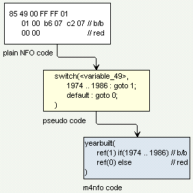 Zwykłe nfo udostępnia zmienne, które mogą być odczytywane i przetwarzane dynamicznie, aby uzyskać dostęp do pewnych atrybutów danej funkcji. W przeciwieństwie do tego, m4nfo dostarcza funkcję dla każdej zmiennej nfo, aw przypadkach, gdy nfo zawija więcej niż jedną wartość w zmiennej, m4nfo dostarcza dodatkowe funkcje lub obsługuje oryginalny schemat nfo przesuwania i maskowania wartości zmiennej przez funkcję pomocniczą shiftmask() .