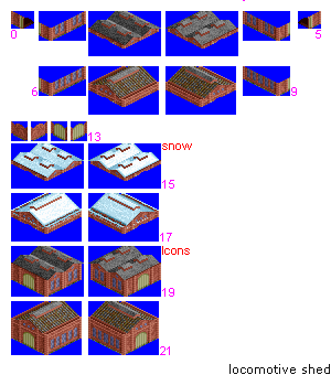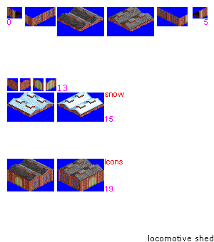 // [0 .. 5] locomotive shed sprite(shed5.pcx 10 10 09 16 21 -31 4) sprite(shed5.pcx 35 10 09 27 43 -32 -7) sprite(shed5.pcx 80 10 09 41 66 -31 1) sprite(shed5.pcx 150 10 09 41 66 -33 1) sprite(shed5.pcx 220 10 09 27 43 -9 -7) sprite(shed5.pcx 270 10 09 16 21 12 4) ...// [10 .. 13] walls & doors sprite(shed5.pcx 10 110 09 18 15 0 0) sprite(shed5.pcx 28 110 09 18 15 0 0) sprite(shed5.pcx 46 110 09 18 15 0 0) sprite(shed5.pcx 64 110 09 18 15 0 0)// [14 .. 15] locomotive shed (snowy roof) sprite(shed5.pcx 10 130 09 41 66 -31 1) sprite(shed5.pcx 80 130 09 41 66 -33 1) ...// [18 .. 19] icon locomotive shed sprite(shed5.pcx 10 223 09 46 66 -31 -15) sprite(shed5.pcx 80 223 09 46 66 -31 -15) ... ) ) def(1) spriteset(little(0),lots(0)) |